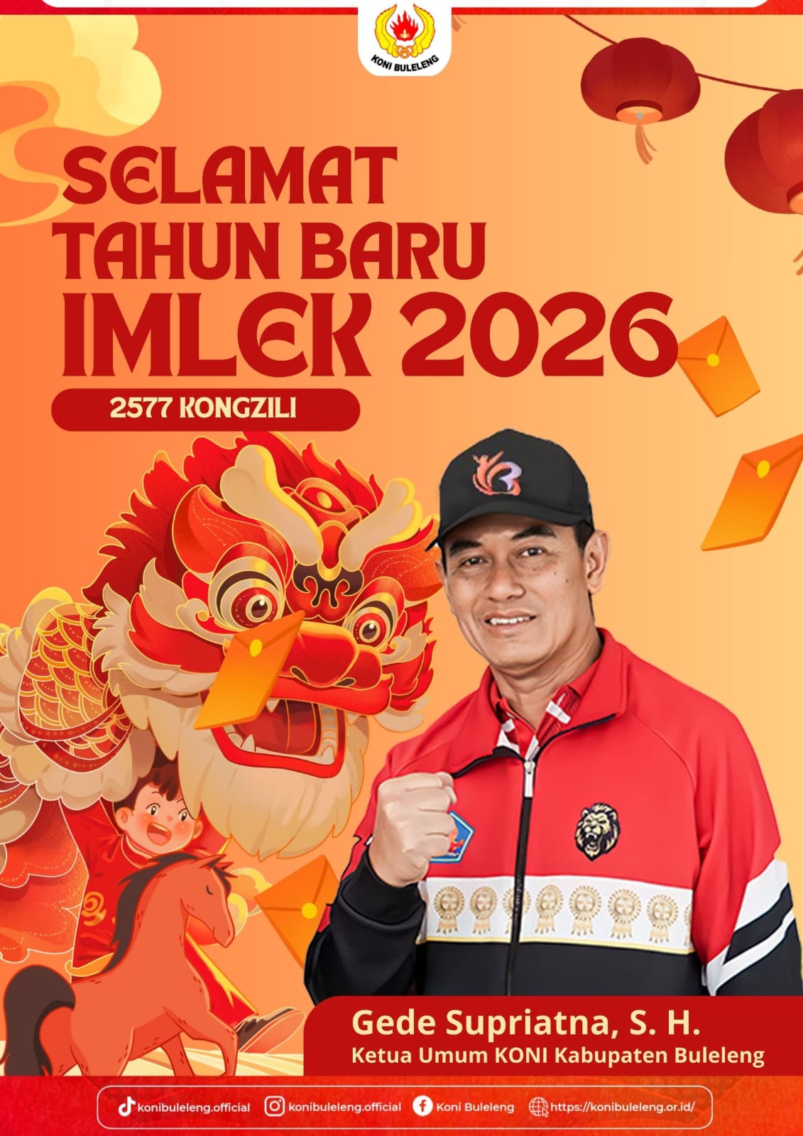 Ketua Umum KONI Kabupaten Buleleng, Gede Supriatna, mengucapkan Selamat Tahun Baru Imlek 2577 Kongzili kepada seluruh umat yang merayakan, khususnya masyarakat Tionghoa di Kabupaten Buleleng.