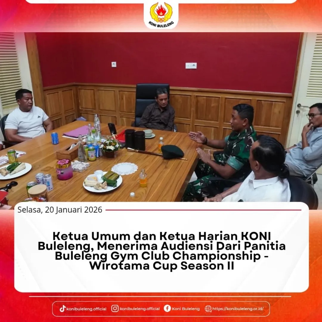 Ketum KONI Buleleng, Gede Supriatna didampingi Ketua Harian KONI Buleleng, I Putu Nova Anita Putra menerima audensi dari Panitia Buleleng Gym Club Championship – Wirotama Cup Season II, Selasa 20 Januari 2026.