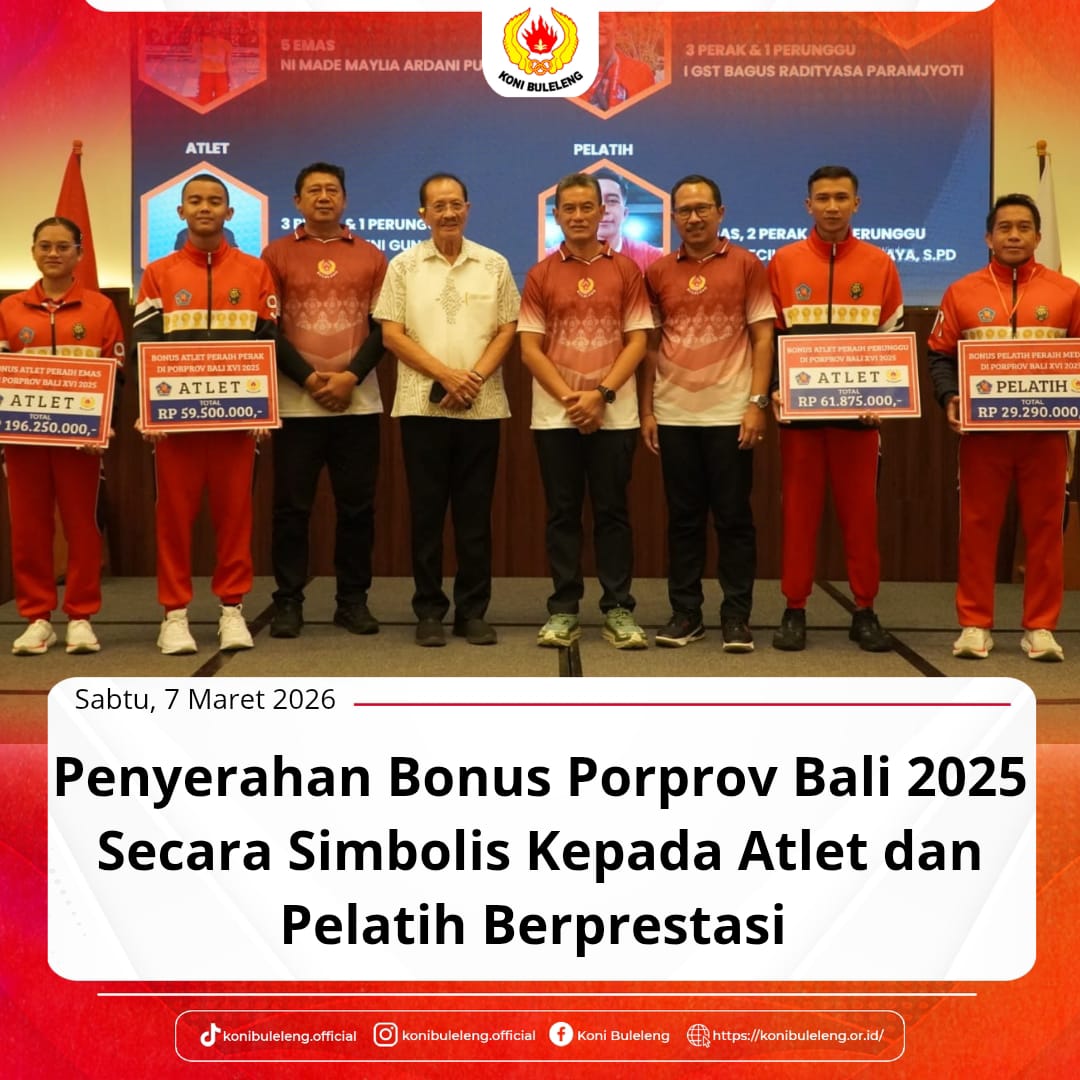 Penyerahan Bonus Porprov Bali 2025 secara simbolis kepada atlet dan pelatih berprestasi, Sabtu (7/3/2026).