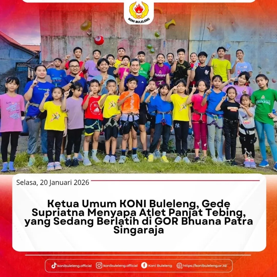 Ketua Umum KONI Buleleng, Gede Supriatna bersama Ketua Harian KONI Buleleng, I Putu Nova Anita Putra menyapa sekaligus memberikan motivasi kepada Atlet Panjat Tebing, yang sedang berlatih di GOR Bhuana Patra Singaraja, Selasa 20 Januari 2026
