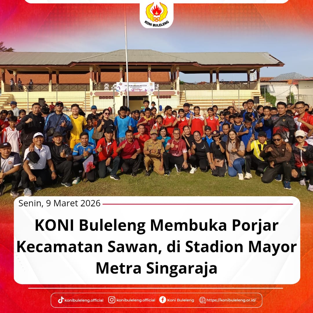Ketua Umum KONI Buleleng, Gede Supriatna didampingi Ketua Harian I Putu Nova Anita Putra dan Waka III Putu Lilik Suryani membuka Porjar Kecamatan Sawan di Stadion Mayor Metra Singaraja, Senin (9/3/2026)